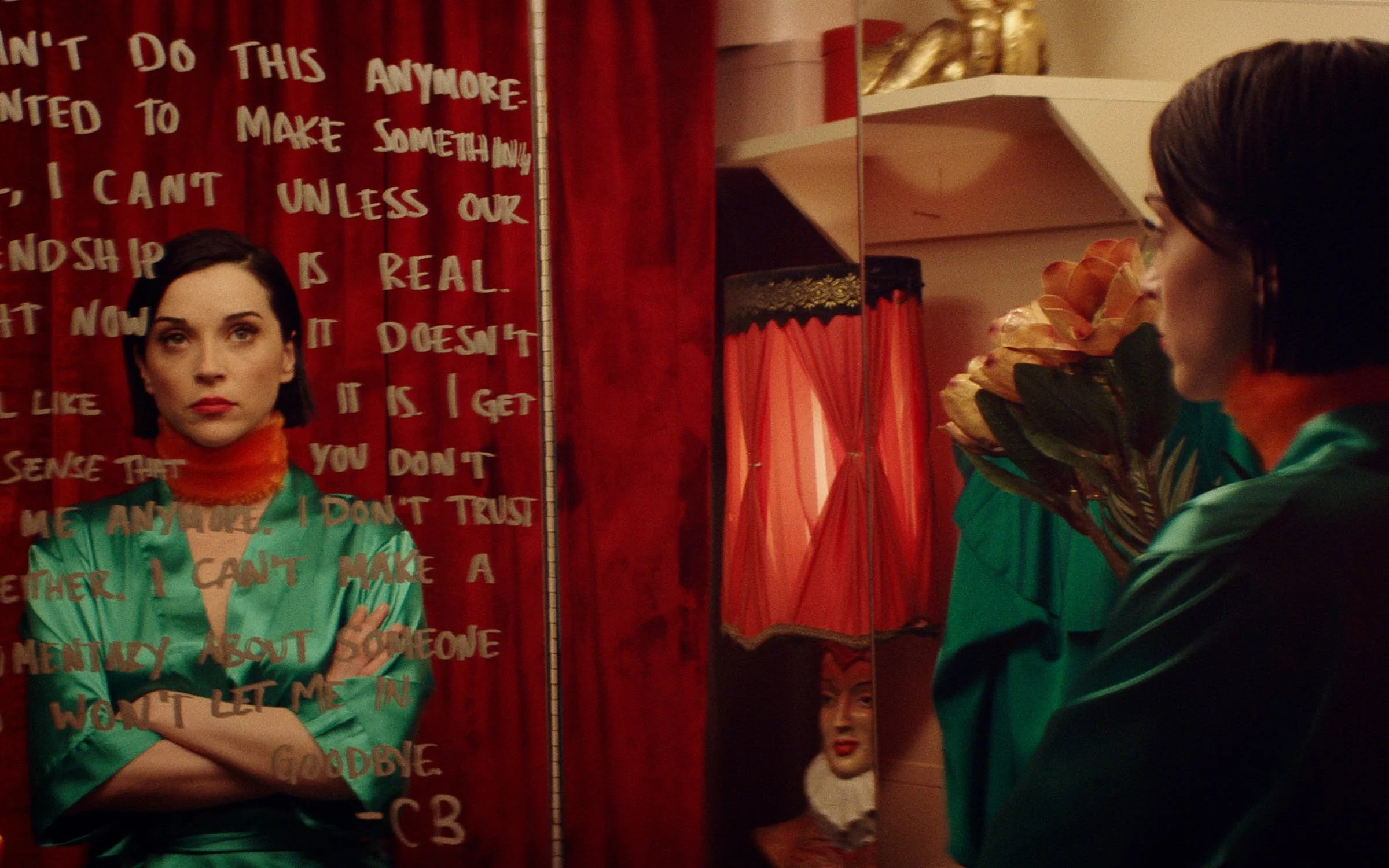 A similar enmeshment of identities occurs in The Nowhere Inn, as St. Vincent’s on-stage persona and real-life identity become progressively intertwined. The film begins with the introduction of best friends Annie Clark (a.k.a. St. Vincent) and Carrie Brownstein (playing herself), who are excited to begin their music documentary on tour. However, the movie takes a turn as Carrie begins to doubt her ability to make an engaging movie about Annie Clark who, in her free time, plays Nintendo Switch for hours and rants about the uselessness of dressing salads when she wants to taste the earthiness of vegetables. After Carrie explains her inability to make this documentary due to the disparity between Annie’s on and off-stage persona, Annie decides that she will become St. Vincent–the ethereal, musical genius that her fans see. Unfortunately, becoming St. Vincent leaves no room for Annie to be an actual human; instead, she becomes a facade of coolness with a lack of empathy. The extreme narcissism of St. Vincent leads Annie to begin to neglect her relationships. She constantly brushes Carrie off and even breaks up with her girlfriend in an attempt to make the documentary more dramatic.