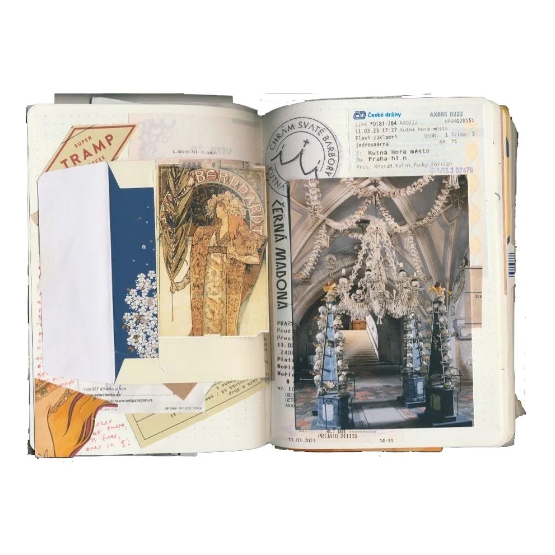 Her apartment, shared with her friends, was filled with Linnea’s art–from portraits to still lifes to film photography. Her art shared a space with vibrant print collages and ceiling-high movie posters, creating a colorful and inspired space. In the kitchen, Linnea pushed a rainbow beaded curtain aside, offering me some tea left behind by a friend from England. On the dining room table lay black and white film prints of her roomate taken by the ferris wheel at Coney Island. When I asked Linnea about her inclination towards depicting her friends in her art, she smiled, saying “I’m so happy to be able to portray them. For these photos, someone else might be like “that's cool I guess” but I see it as “oh my god that was such a fun day at Coney Island!” Whether a picture of a day at Coney Island or a painting of a moment of quiet studying, Linnea is fascinated by the mundanity of life. Her current project is her weekly collage, made up of the wonders and scraps of the week. “I collect a bunch of stuff that most people would think is trash, but I choose very carefully. My memory is not great sometimes, and it's so easy to forget what happened. I’m super interested in the process of recording my life and others’ and those small stories that you would otherwise forget about.” As we talked, she quietly took the sticker label off a discarded pound cake wrapper that would later find its place in her collage. “It's also really nice to have a private practice for yourself,” she added, “and collages are helping me let go of perfection.”
