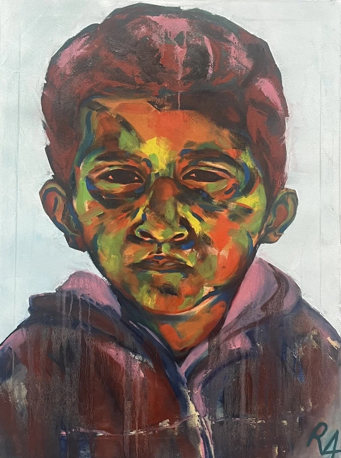 In her studio, Ray often works on multiple canvases at once, cycling through mini portraits while developing larger pieces. She experiments with texture and integrates text—prayers, news headlines, excerpts from fundraising campaigns—into her work. She likes carrying brushes in her mouth while she paints, like a pirate. “It’s messy, but it keeps me moving.” She looks at the work of photojournalists until a photo stops her, and she can’t stop looking into someone’s eyes—that’s when she knows she needs to paint it. If the reference photo isn’t linked to a fundraiser, she identifies families in similar circumstances and directs any profits made from the work towards their campaigns. More often now, Ray has been finding reference photos through families that message her over Instagram, asking for help.