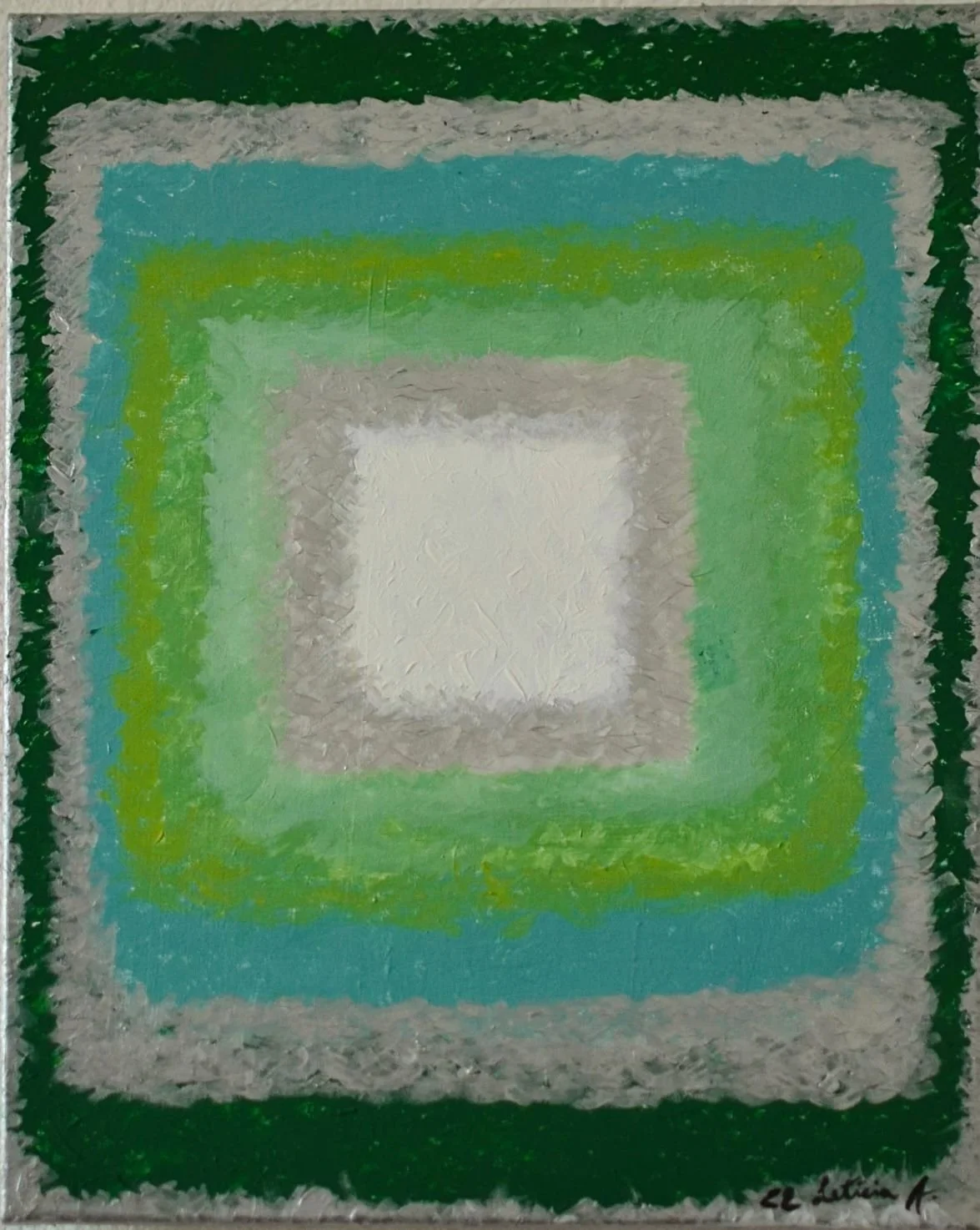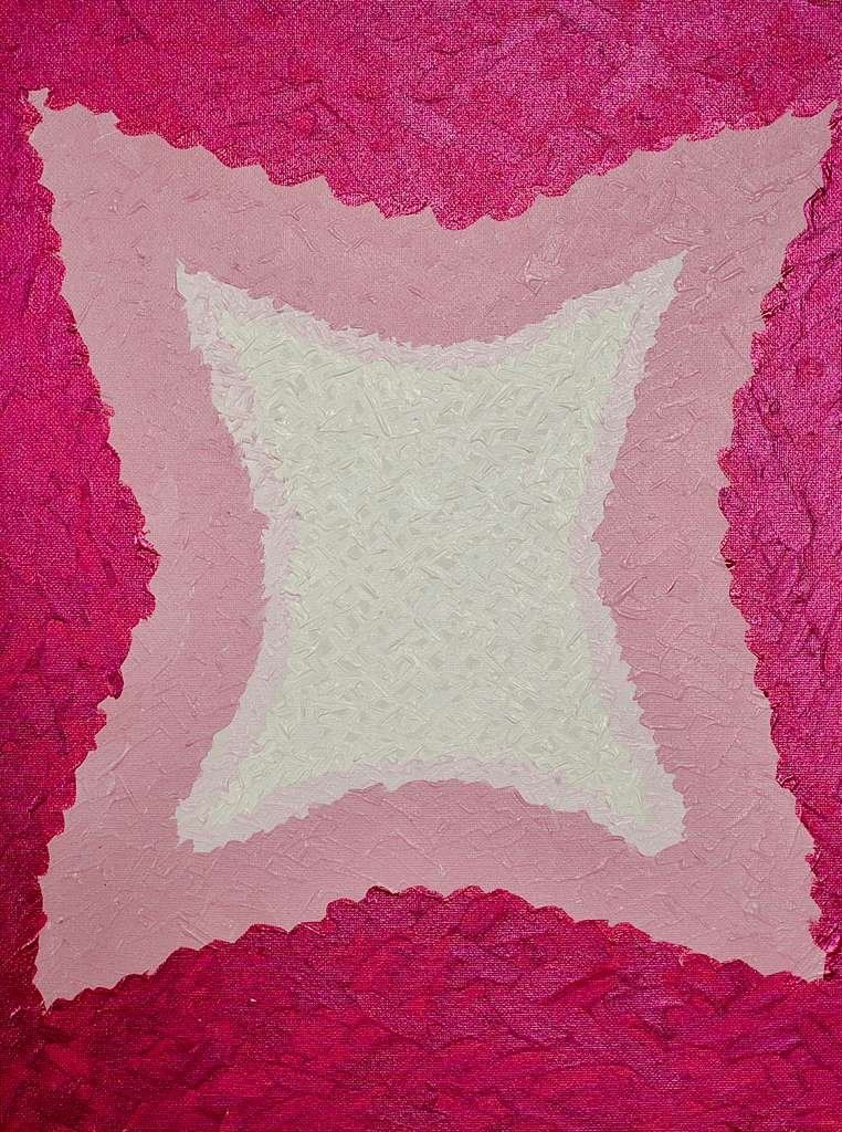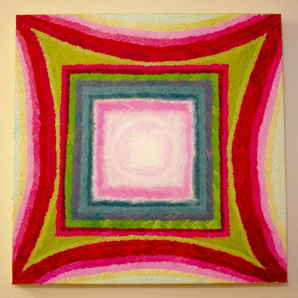 “But how does this equilibrium sustain itself throughout everything?” I beseech her. How does she use painting to communicate with it? She starts by telling me that when she was in the Amazon, she contacted a shaman to try ayahuasca, in hopes that she might "see" a work of art…one twelve-hour trip later, she concluded that it did not provide the concrete experience hearsay had promised her, but instead, an abstract expressionist churning of energies. Inspired by this newfound way of visualizing things, she (sober) then meditated Unconditional Love into fruition. Another meditation two years later had an afterlife in the marvelously pink Self Love (2023); "They say it's not like official chakra, but above the throat, there is a self love chakra that is pink [...] for this one"—Leticia points to a green-and-pink painting with the square of Unconditional Love superimposed onto the four-pronged shape in Self Love—"I didn't even meditate it. I just combined the two paintings I did [while] meditating before."