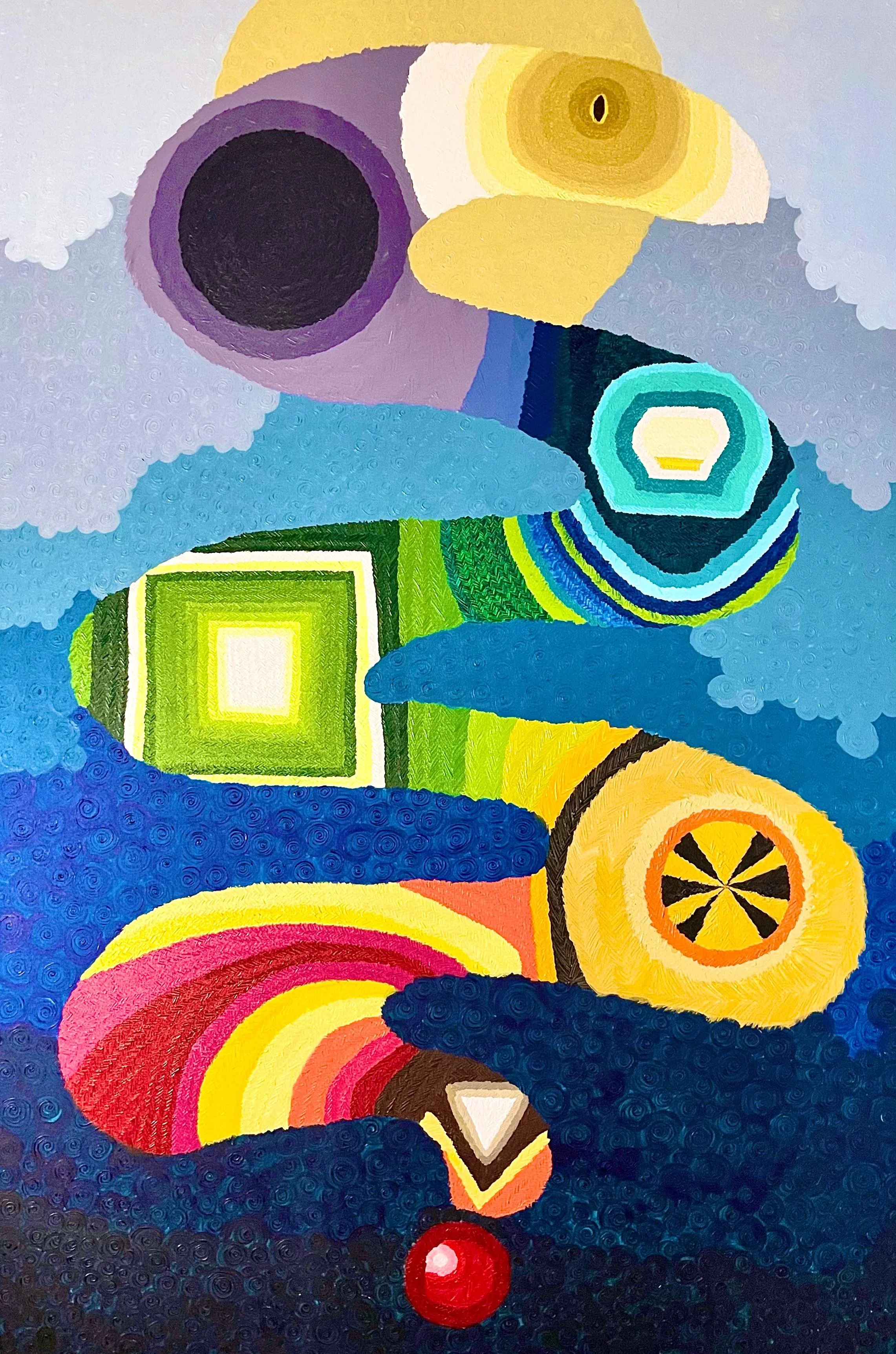 Eventually, she tells me, she would love to have an art temple where people can "merge with the energy of the paintings," where the divine is a matter of personal exploration. Hilma Af Klint (a print of No. 2 from The Ten Largest is on Leticia's wall), who conceived of a similar idea, is brought up, as well as Mark Rothko, whose chapel in Houston (built in 1971) continues to attract many visitors. She's also inspired by how ARTECHOUSE in Chelsea uses VR to construct an immersive experience, though she wishes to use it for something that has more of a "human touch." Human touch: a crucial component of Leticia's artistry. The temple is an "eventual thing," she expresses to me. Breaking the horizon and yet lining the apartment walls right in front of me, what she is manifesting makes me think that for her, eventuality is not something that is unclear or indeterminate. Leticia Abasto, painter and traveler, catches this wave with her canvas, and in doing so she, too, forms outside time, in every place.