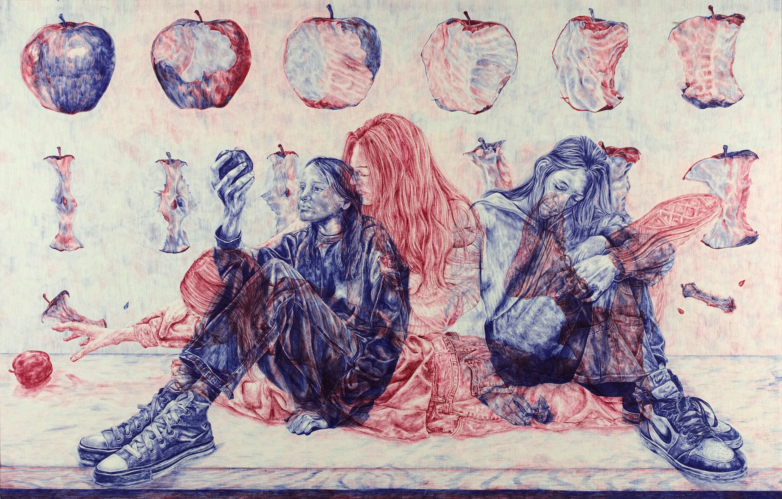 One standout piece, Evolutionary Byproduct, embodies these themes through surrealist imagery. Using a photograph of a friend as a base, Madison layered a rabbit head, then a wolf outline, over the figure’s face in a way that blended realism with allegory. “It’s about minorities masking themselves, assimilating to seem less attackable,” she explained. The rabbit–wolf dynamic felt natural for that tension. In contrast, a ballpoint drawing titled Bitter Rot, turns inward. It inquires into past and present selves, perfectionism, and the unattainable: a young figure—Madison herself—reaches for an apple that decays before it can be grasped. Rendered with careful detail, the apple becomes both alluring and repellent. “It’s symbolic of how past selves yearn for things that don’t exist anymore or aren’t permanent,” she told me, reflecting on the transience of ambition and expectation. The choice behind the fruit is not accidental either. “I used the apple as a symbol for American academic culture. At first glance, the apple looks like a symbol of achievement, but here it’s being eaten and decaying. I liked playing with that contradiction.” The work lingers on the ache of perfectionism and the quiet grief of realizing that some ambitions, once attained, dissolve on contact.